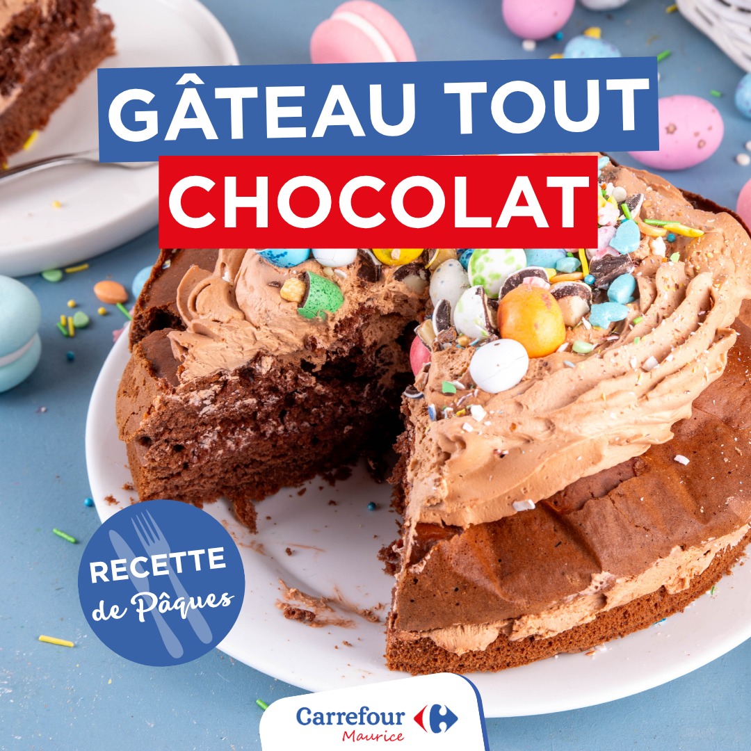 May be an image of cake and text that says "GÂTEAU TOUT CHOCOLAT RECETTE de Paques Carrefour Maurice"