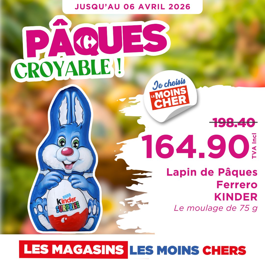 May be an image of ‎text that says "‎JUSQU'AU 06 AVRIL 2026 PÂQUES CROYABLE! choisis MOINS CHER Kinder SURPRISE 6 198.40 164.90 באל leu Lapin de Pâques Ferrero KINDER Le moulage de 75 g LES MAGASINS LES MOINS CHERS‎"‎