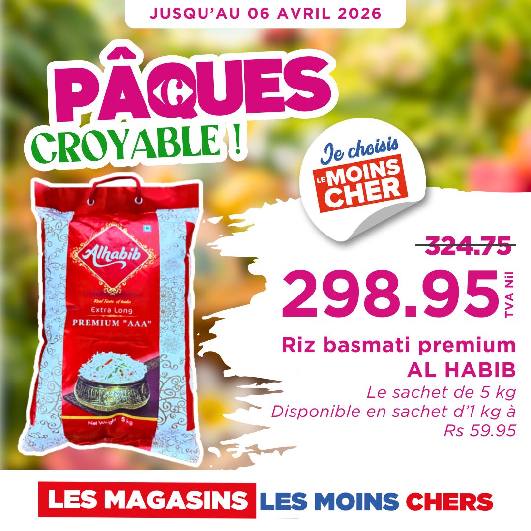 May be an image of ‎text that says "‎JUSQU'AU 06 AVRIL 2026 PÂQUES CROYABLE! choisis MOINS CHER Alhabib 2ណក BuTeedda ExtraLong PREMIUM "AAA" উক 324.75 298.95 H ال Riz basmati premium AL A Le sachet de 5 kg Disponible en sachet d'l kg à ...
