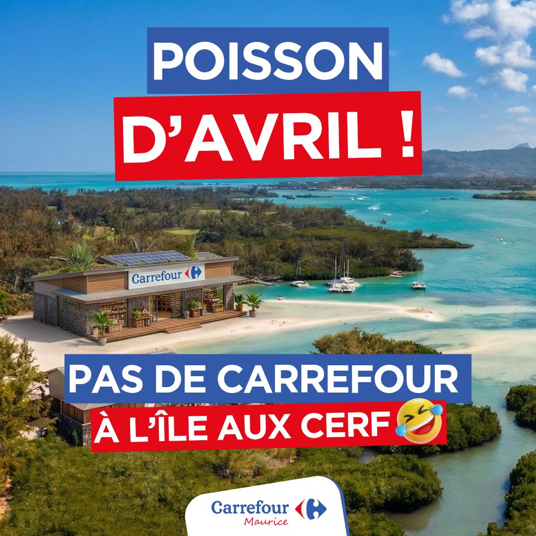 May be an image of text that says "POISSON D'AVRIL! Carrefour PAS DE CARREFOUR À L'ÎLE AUX CERF Carrefour Maurice"