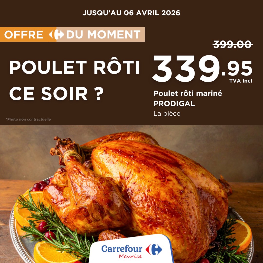 May be an image of text that says "JUSQU'AU 06 AVRIL 2026 OFFRE DU MOMENT 399.00 POULET RÔTI 339.95 95 TVA TVAIncl Incl CE SOIR? Poulet rôti mariné PRODIGAL La pièce Carrefour Maurice"