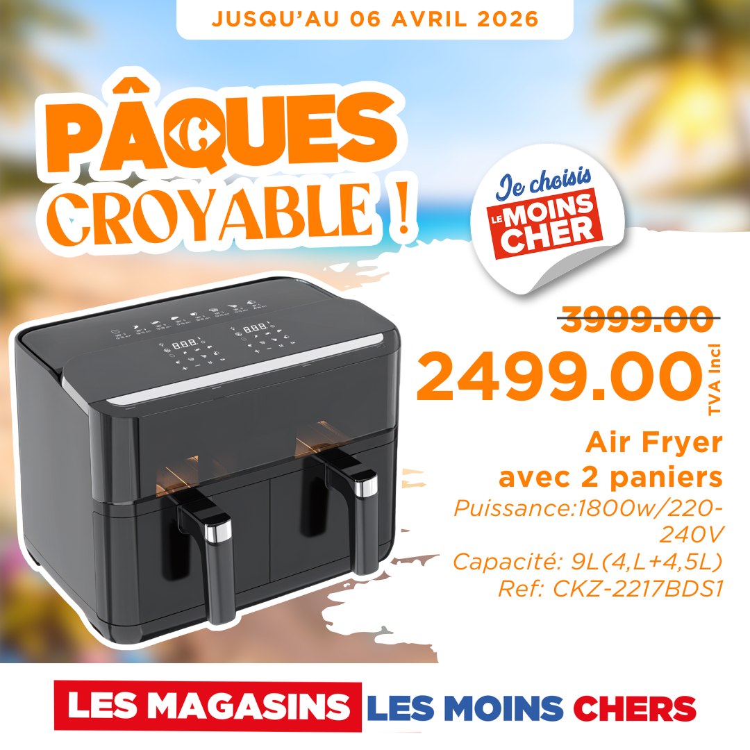 May be an image of text that says "JUSQU'AU 06 AVRIL 2026 PÂQUES CROYABLE choisis MOINS CHER 888 88B 3999.00 2499.00 MapH ley Air Fryer 2 paniers Puissance:1800w/220- 240V Capacité: 9L(4,L+4,5L) Ref: CKZ-2217BDS1 LES MAGASINS LES MOINS CHERS"
