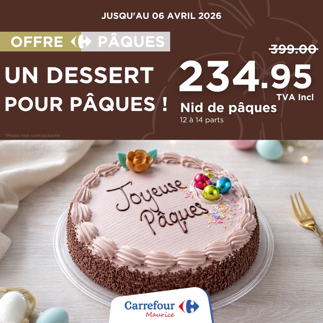 May be an image of text that says "JUSQU'AU 06 AVRIL 2026 OFFRE OFFRE PÂQUES 399.00 UN DESSERT 234.95 95 POUR PÂQUES! TVAIncl Incl Nid de pâques 12 12à14parts à 14 parts Joyeuse Γάμμει Carrefour Maurice"