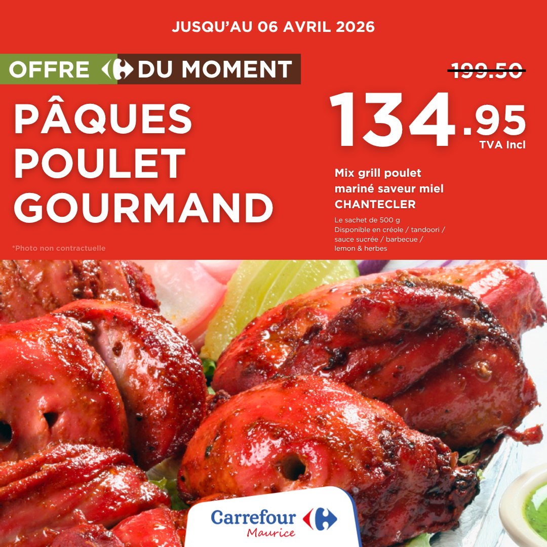May be an image of text that says "JUSQU'AU 06 AVRIL 2026 OFFRE DU MOMENT PÂQUES POULET GOURMAND 134.95 95 Incl Mix Mixgrillpoulet grill poulet mariné marinésaveu saveur miel CHANTECLER de500 andoori/ sauce sucróc barbecue/ emon herbes Carrefour Ma...