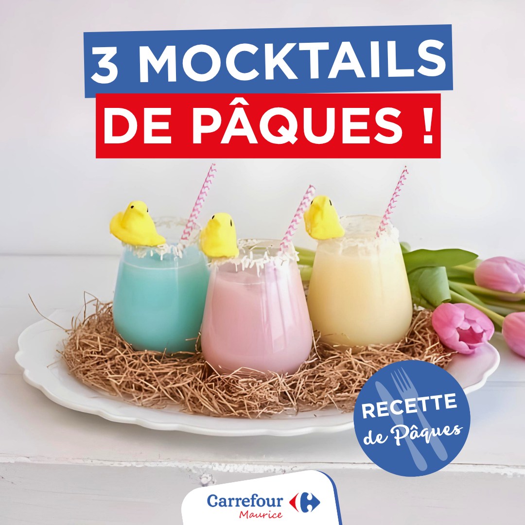 May be an image of text that says "3 MOCKTAILS DE PÂQUES ! RECETTE de Paques Carrefour Maurice"