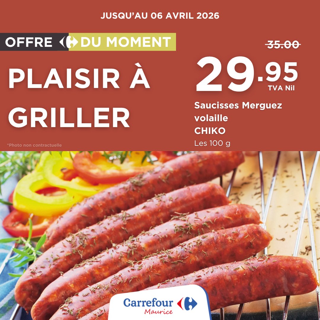 May be an image of text that says "JUSQU'AU 06 AVRIL 2026 OFFRE DU MOMENT PLAISIR À GRILLER *Photo.non.contractuellie contractuelle 35.00 29.95 TVANil TVA Nil Saucisses Merguez volaille CHKO Les 100 g Carrefour Maurice"