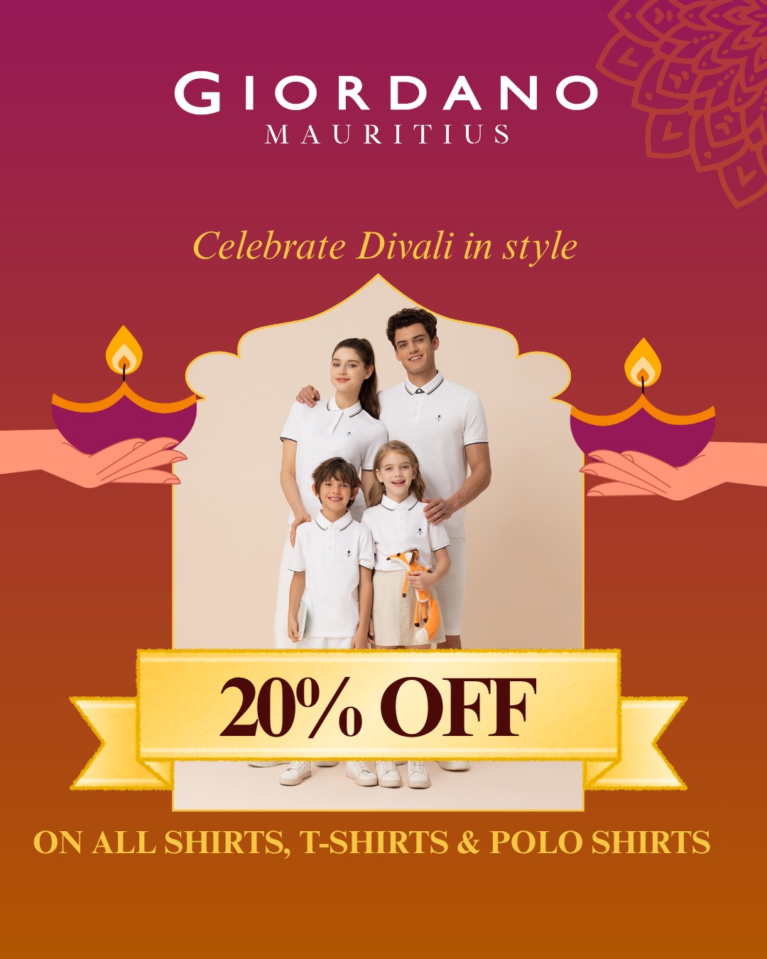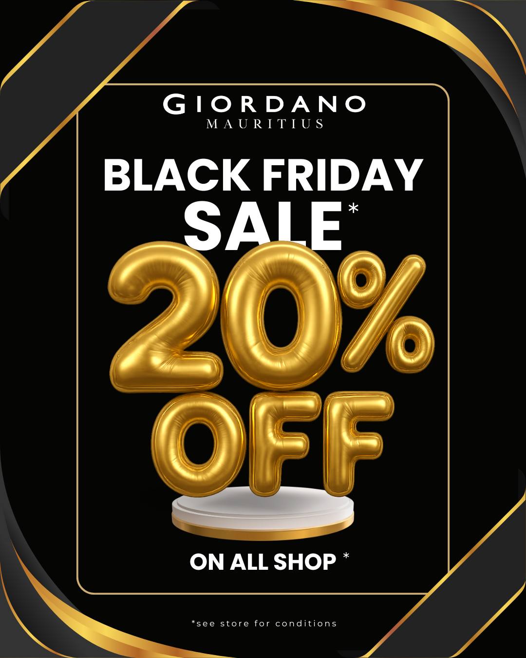 May be an image of text that says "GIORDANO MAURITIUS BLACK FRIDAY SALE 20% OFF ON ONALLSHOP* ALL SHOP "see seestorefor.conditions store or cond tions"