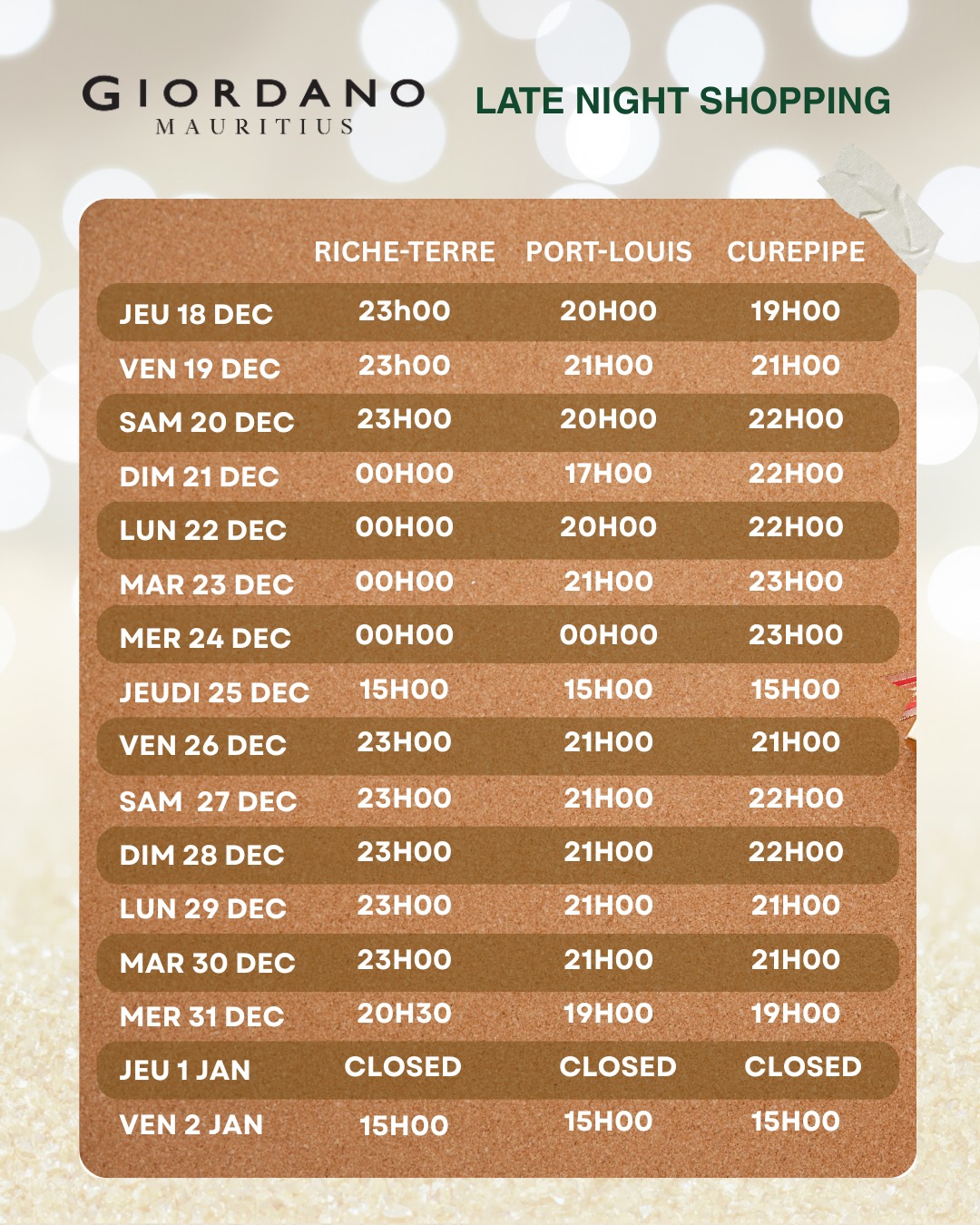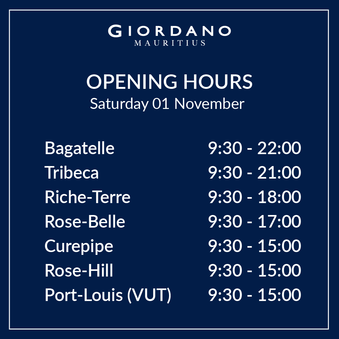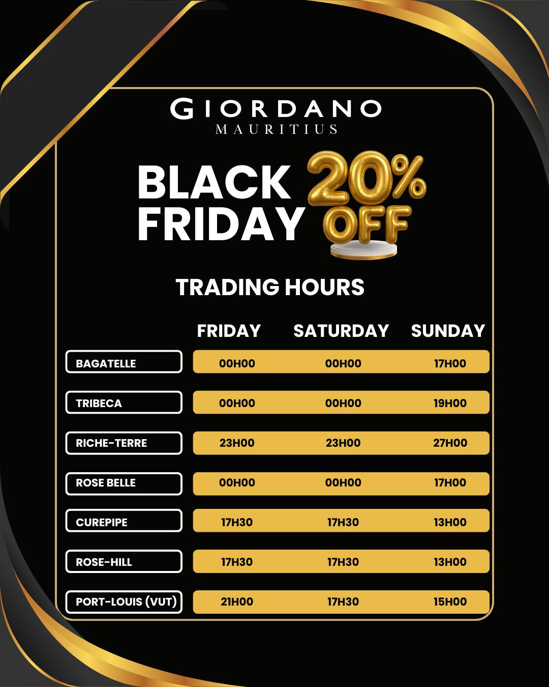 May be an image of text that says "GIORDANO MAURITIUS BLACK 20% FRIDAY OFF TRADING HOURS FRIDAY BAGATELLE SATURDAY OOHOO TRIBECA SUNDAY OOHOO 00HOO 17H00 RICHE-TERRE TERRE RICHE- OOHOO 23H00 19H00 ROSE BELLE 23Hoo OOHOO 27H00 CUREPIPE OOHOO 17H30 17H00...