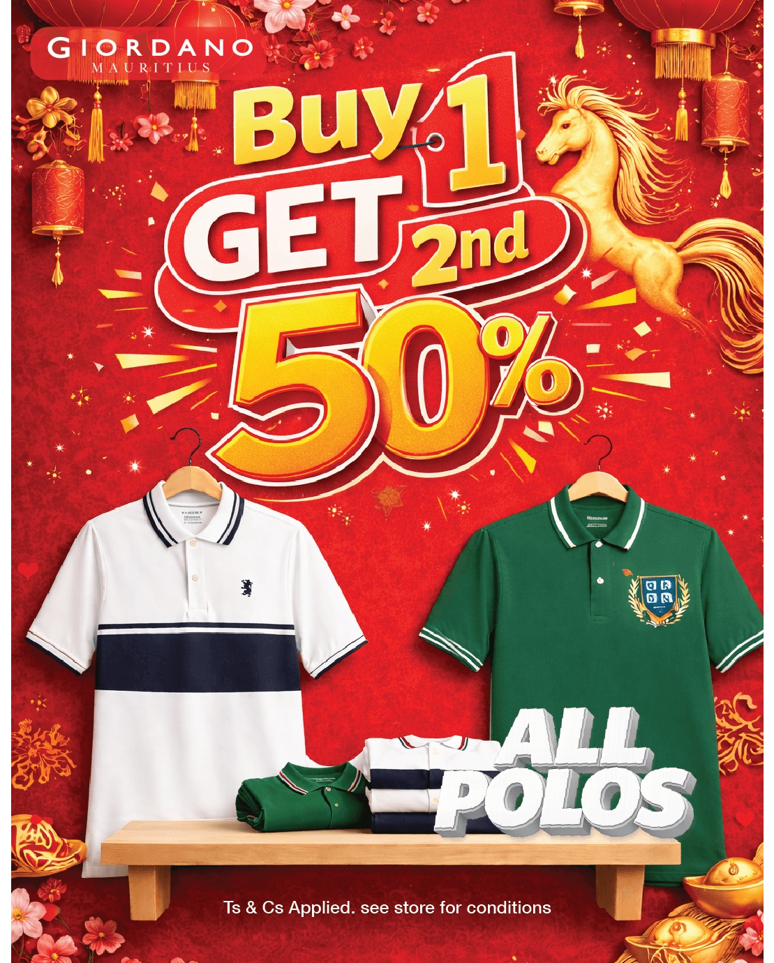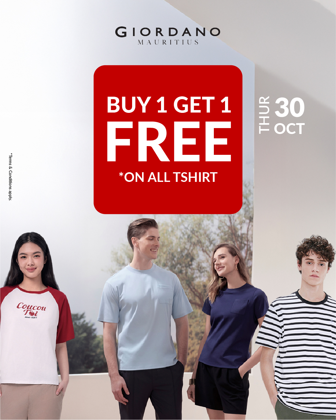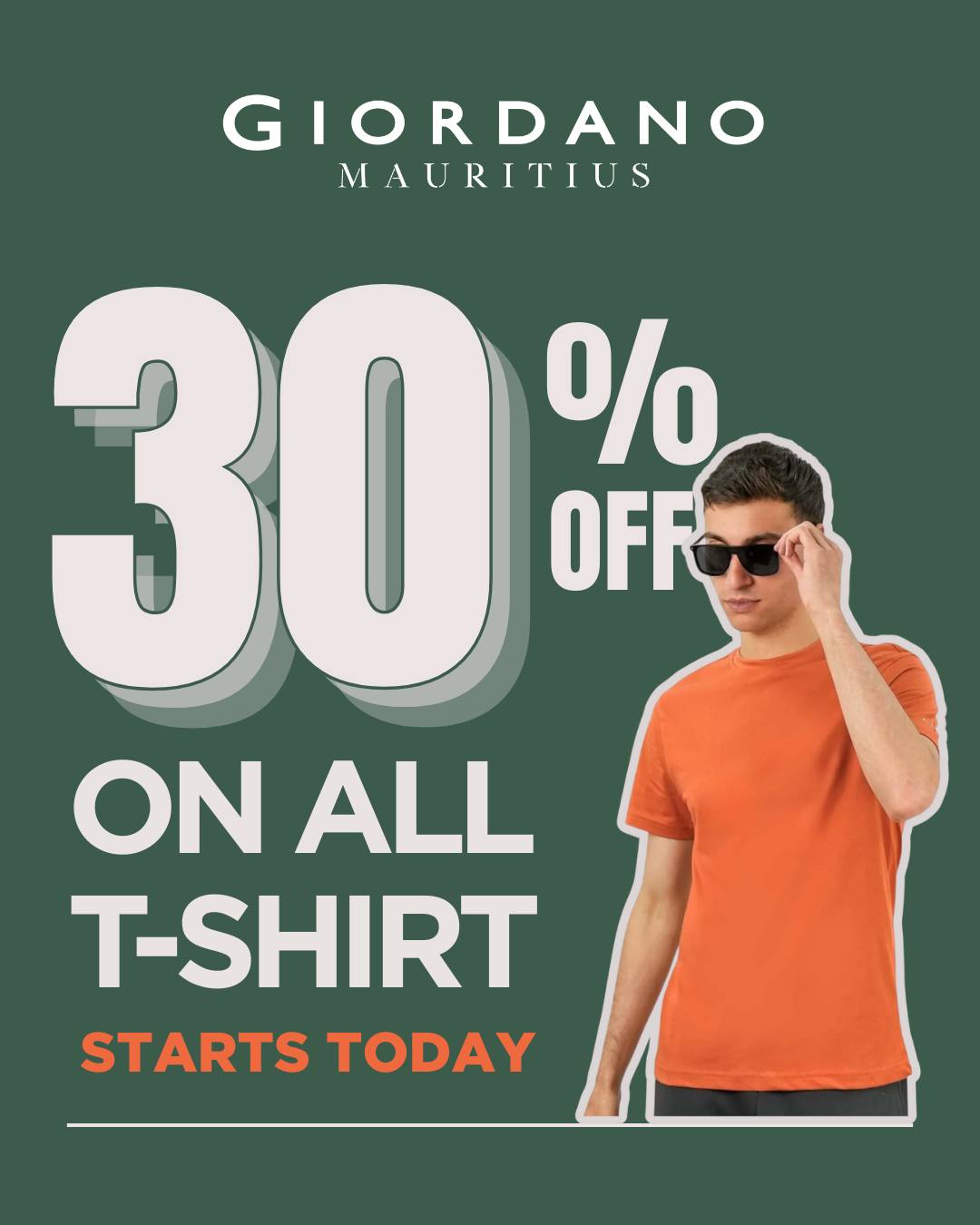 May be an image of text that says "GIORDANO MAURITIUS M 30% % OFR ON ALL T-SHIRT STARTS TODAY"