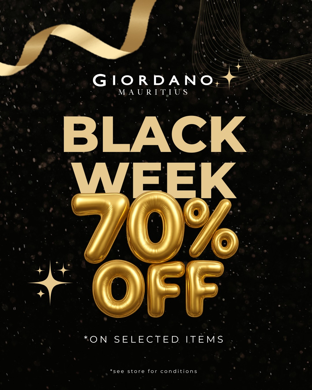 May be an image of text that says "GIORDANO MAURITIUS M BLACK WEEK 70% 0 OFF *ONSELECTEDITEMS *ON SELECTED ITEMS *see stare *seestorefor.conditions for conditions"