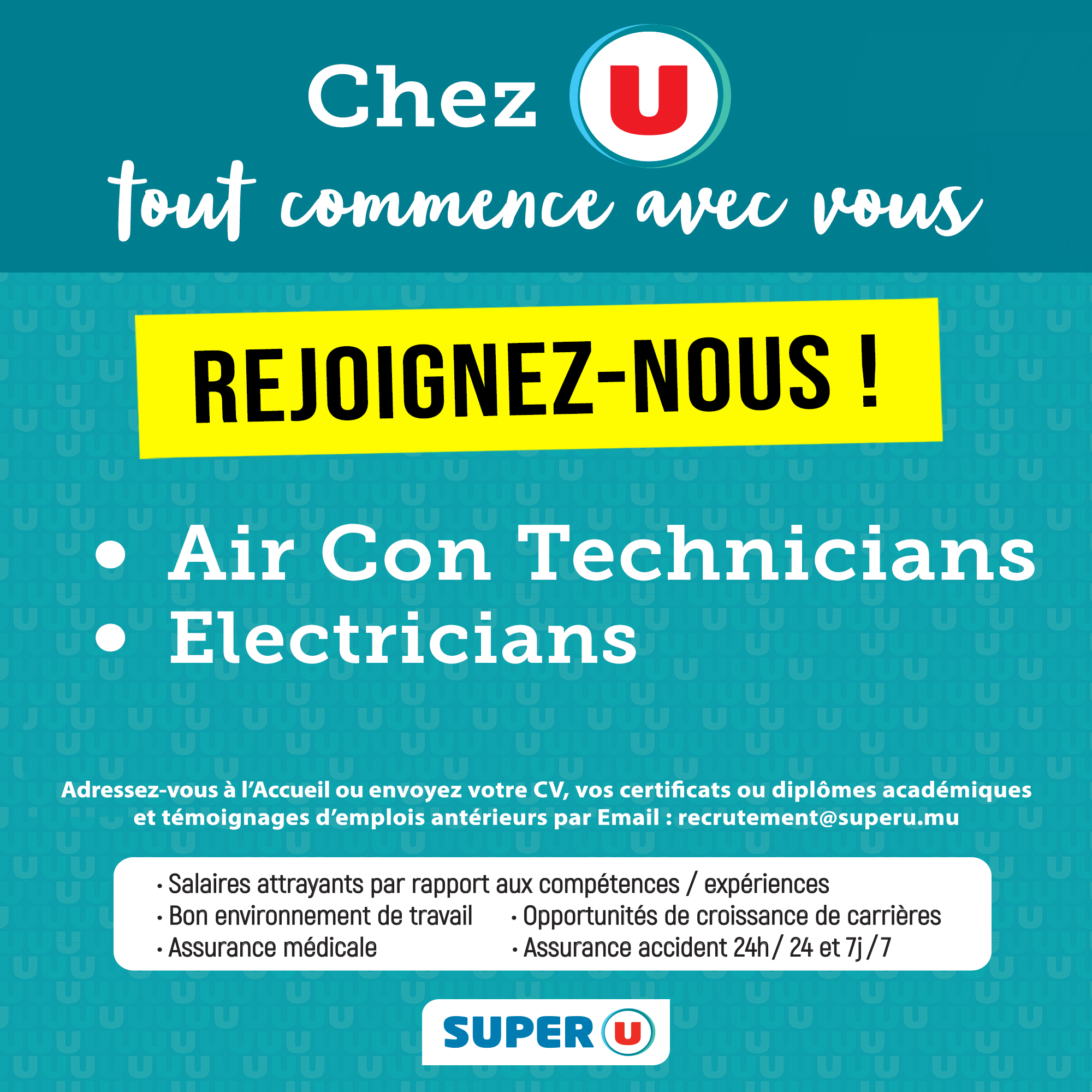 May be an image of water heater and text that says "Chez U tout commence avec vous REJOIGNEZ-NOUS! Air Con Technicians Electricians Adressez-vous à l'Accueil ou envoyez votre CV, vos certificats จบ diplômes académiques et témoignages d'emplois ...