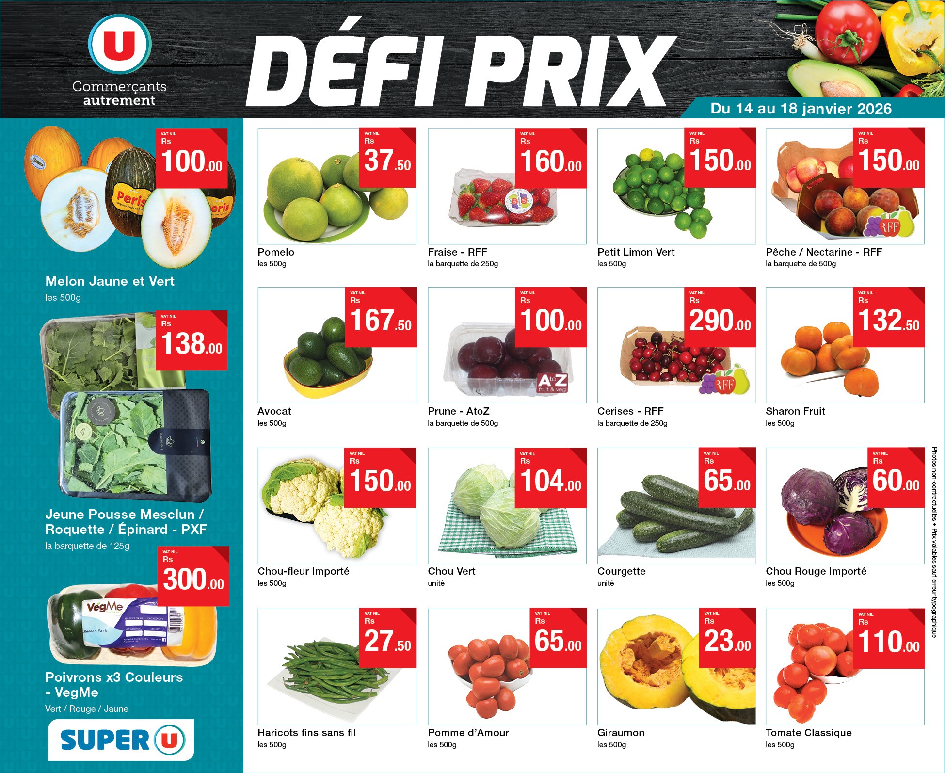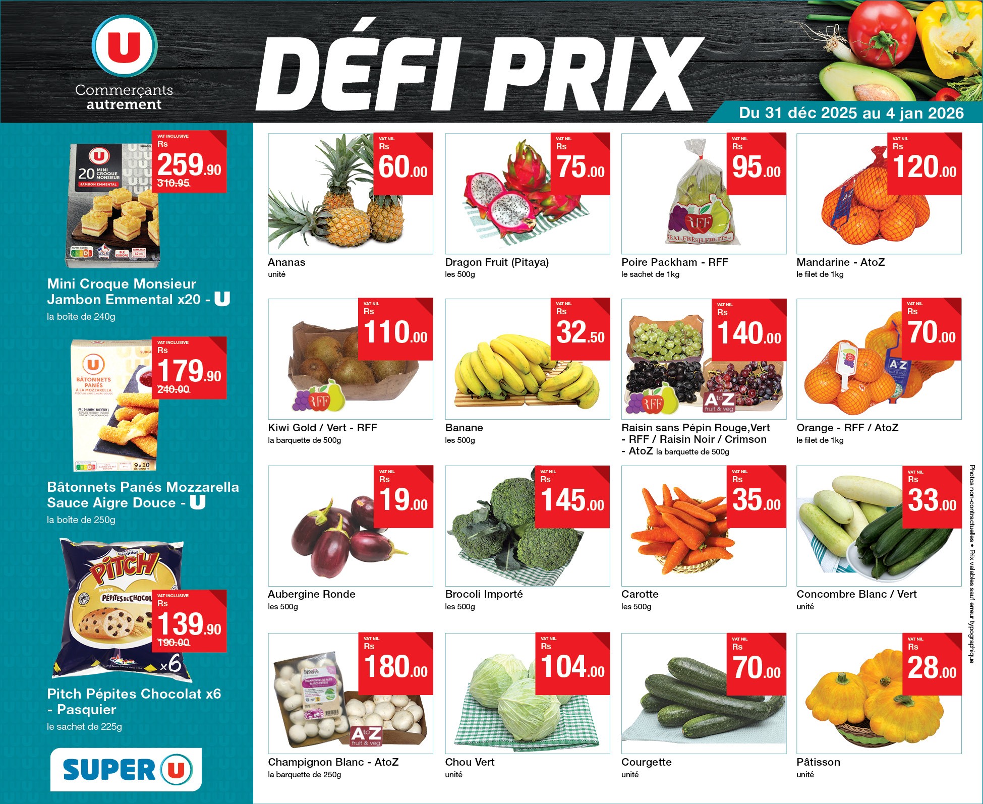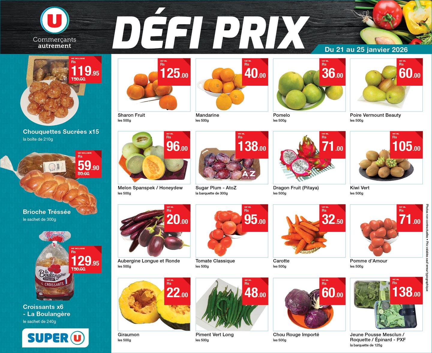 May be an image of tofu and text that says "U Commerçants autrement 119.95 T50.00 DÉFI PRIX 125. 00 Du 21 au 25 janvier 2026 40 .00 Sharon Frult kaaG00g 36.00 Chouquettes Sucrées x15 labofte 210g Mandarine hes600g 60.00 00 Pomelo ๒9500 OFi 96. 59....