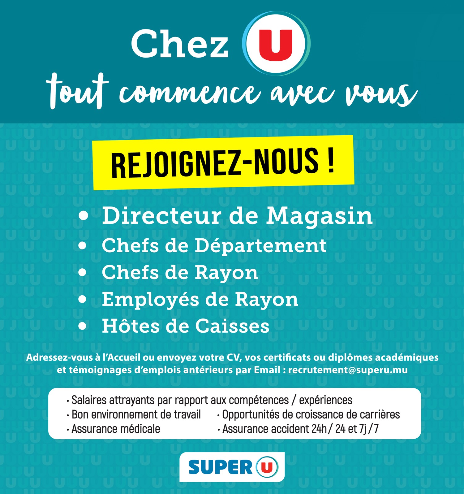 May be an image of text that says "Chez U tout commence avec vous REJOIGNEZ-NOUS! Directeur de Magasin Chefs de Département Chefs de Rayon Employés de Rayon Hôtes de Caisses Adressez-vous à l'Accueil ou envoyez votre CV, vos certificats ou diplôme...