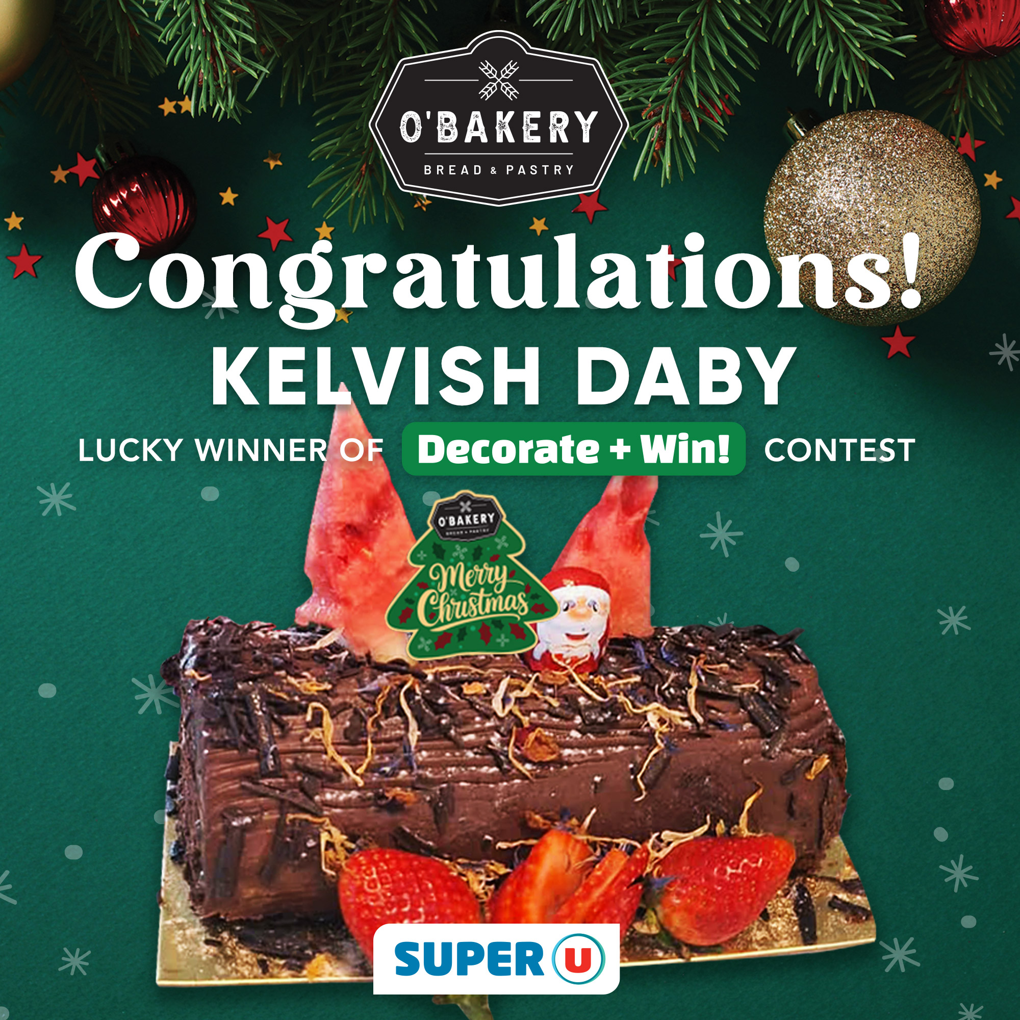 May be an image of ‎text that says "‎O'BAKERY BREAD BREADPASTRY PASTRY Congratulations! KELVISH DABY LUCKY WINNER LUCKYWINNEROF OF Decorate + Win! CONTEST O'BAKERY Merry Chustmas זבת SUPER‎"‎