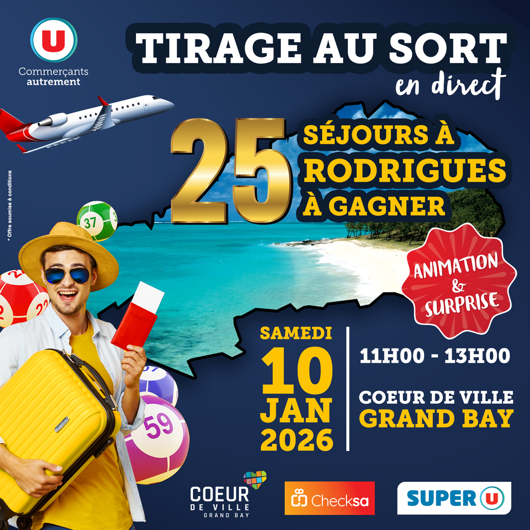 May be an image of text that says "U Commerçants autrement TIRAGE AU SORT en direct 37 25 À GAGNER SÉJOURS À RODRIGUES ANIMATION & SURPRISE 11H00 -13H00 SAMEDI 10 JAN 2026 59 COEUR DE VILLE GRAND BAY COEUR D DEVILLE GRAND GRANDBAY BAY ធ Checksa S...