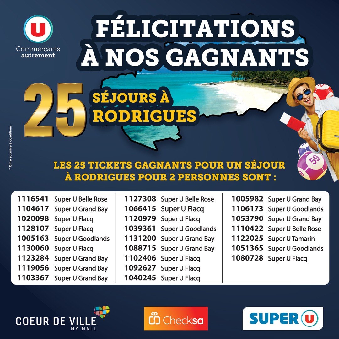 May be an image of text that says "Commerçants autrement FÉLICITATIONS À NOS GAGNANTS 25 RODRIGUES SÉJOURS À LES 25 TICKETS GAGNANTS POUR UN SÉJOUR RODRIGUES POUR PERSONNES SONT: Belle Rose Grand Bay 1116541 Super 1104617 Super 1020098 Super 1128...
