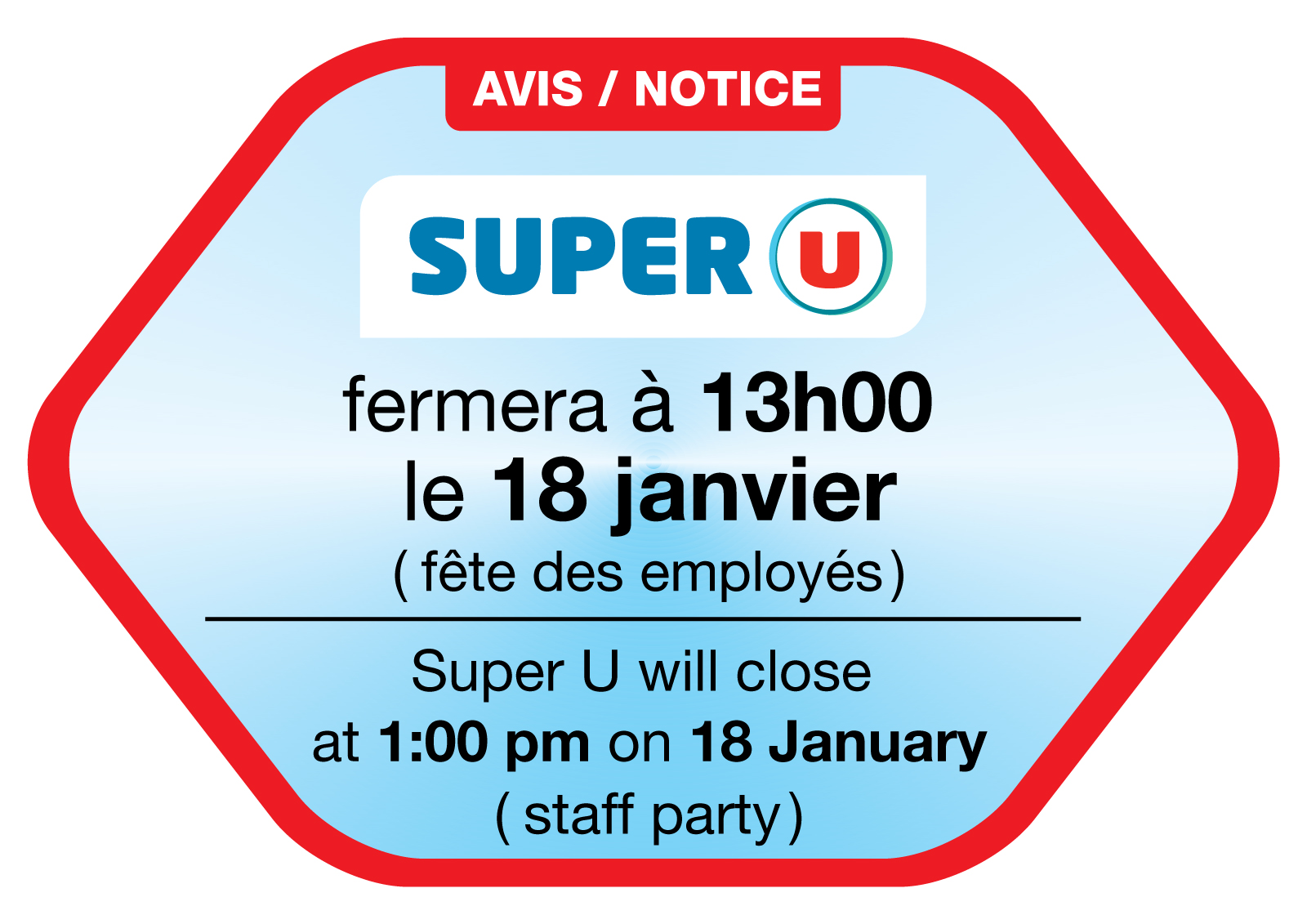 May be an image of text that says "AVIS AVIS/NOTICE / NOTICE SUPER U fermera à 13h00 le 18 janvier (fête des employés) Super U will close at 1:00 pm on 18 January (staff party)"