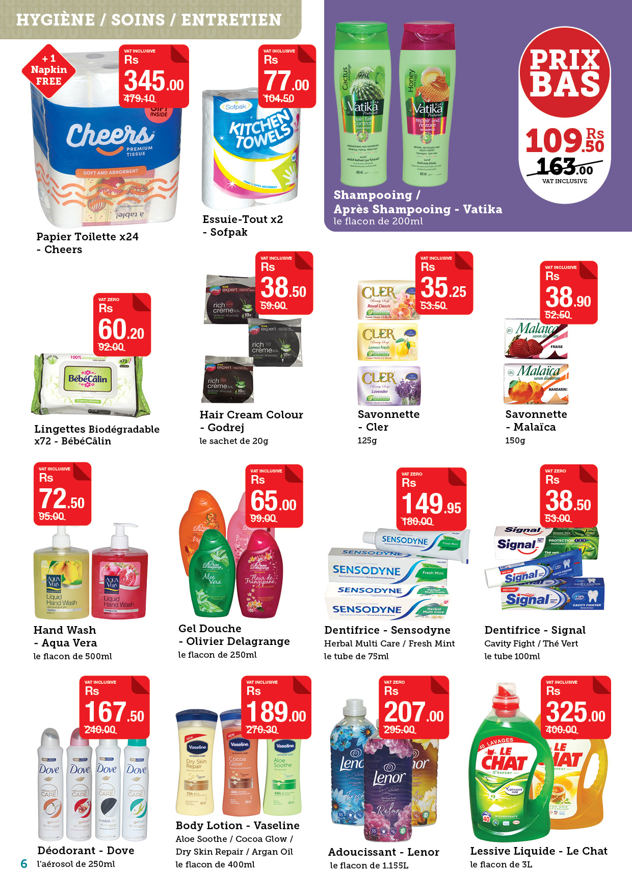 May be an image of text that says "HYGIÈNE SOINS/ ENTRETIEN Napkin FREE 345. 479.10 104.50 Cheers PRIX BAS TOWELS Papier Toilette x24 Cheers Essuie- -Sofpak 109.30 163.00 VATEACLUSIVE Après Shampooing Vatika 200ml 38.50 59.00 92:00 35.25 53.50 38. 52...