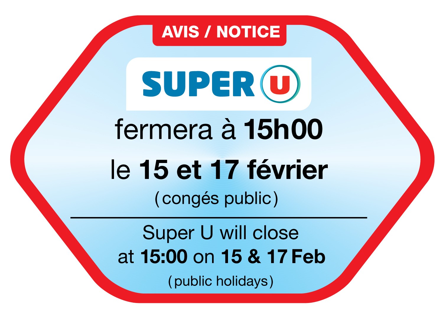 May be an image of text that says "AVIS / NOTICE SUPER fermera à 15h00 le 15 et 17 février (congés public) Super U U will close at 15:00 on 15 & 17Feb (public holidays)"